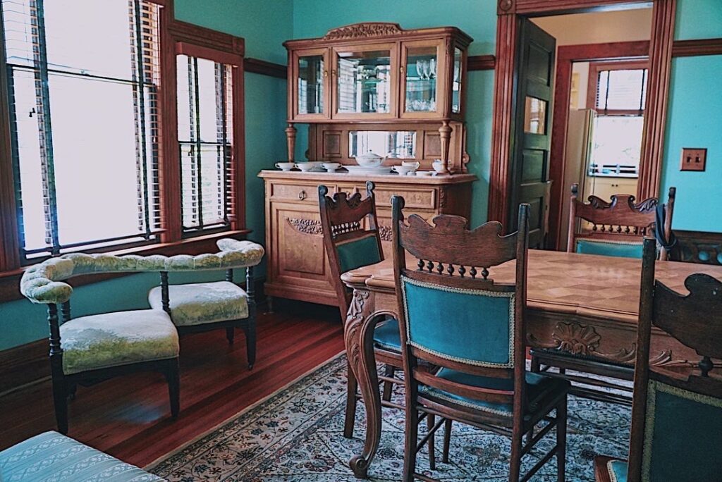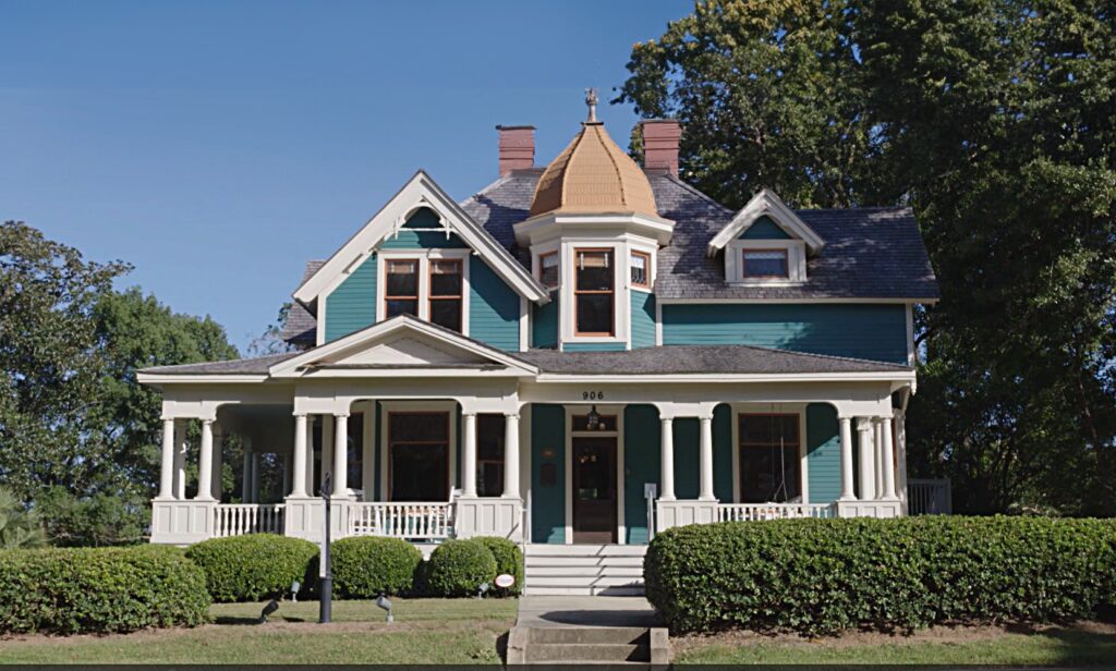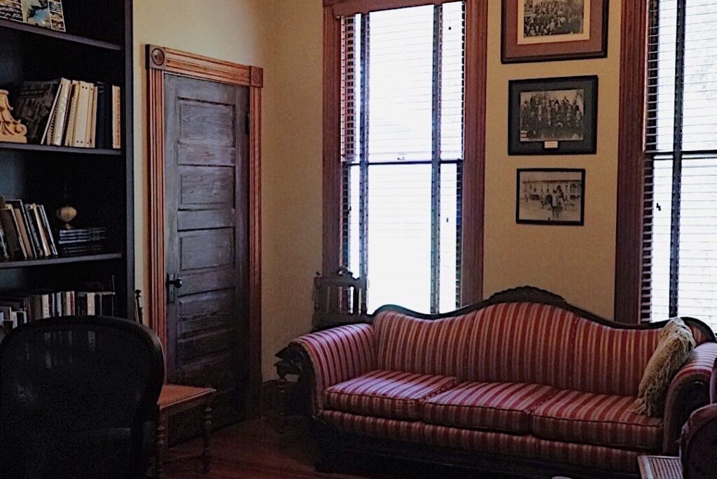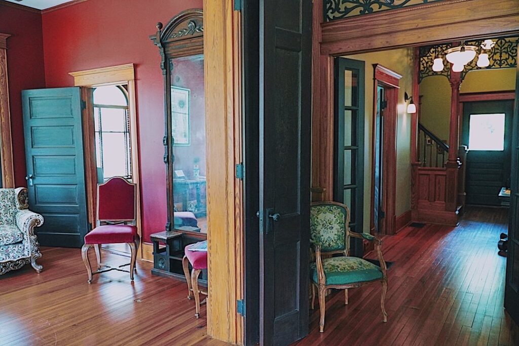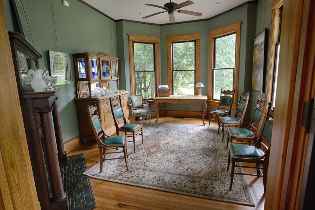 Our 1910 Classic Queen Anne has two parlors, dining room, library, catering kitchen and an ADA compliant bathroom, as well as a front wrap around porch and back porch with an ADA accessible ramp.